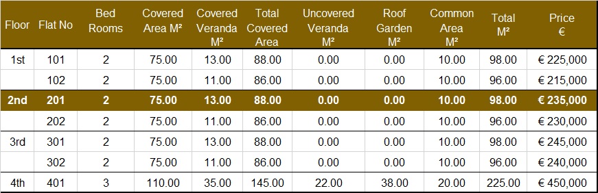Весь комплекс состоит всего из 7 квартир. Две квартиры на каждом из этажей 1,2 и 3, и один пентхаус, квартира на целом этаже на 4 этаже. Конструкция имеет современный дизайн и архитектуру. В рассматриваемых апартаментах есть семейная спальня площадью 11 м², главная спальня площадью 13 м², не включая основные ванные комнаты с ванной комнатой, две ванные комнаты, кухня со столовой и гостиной и просторный балкон.