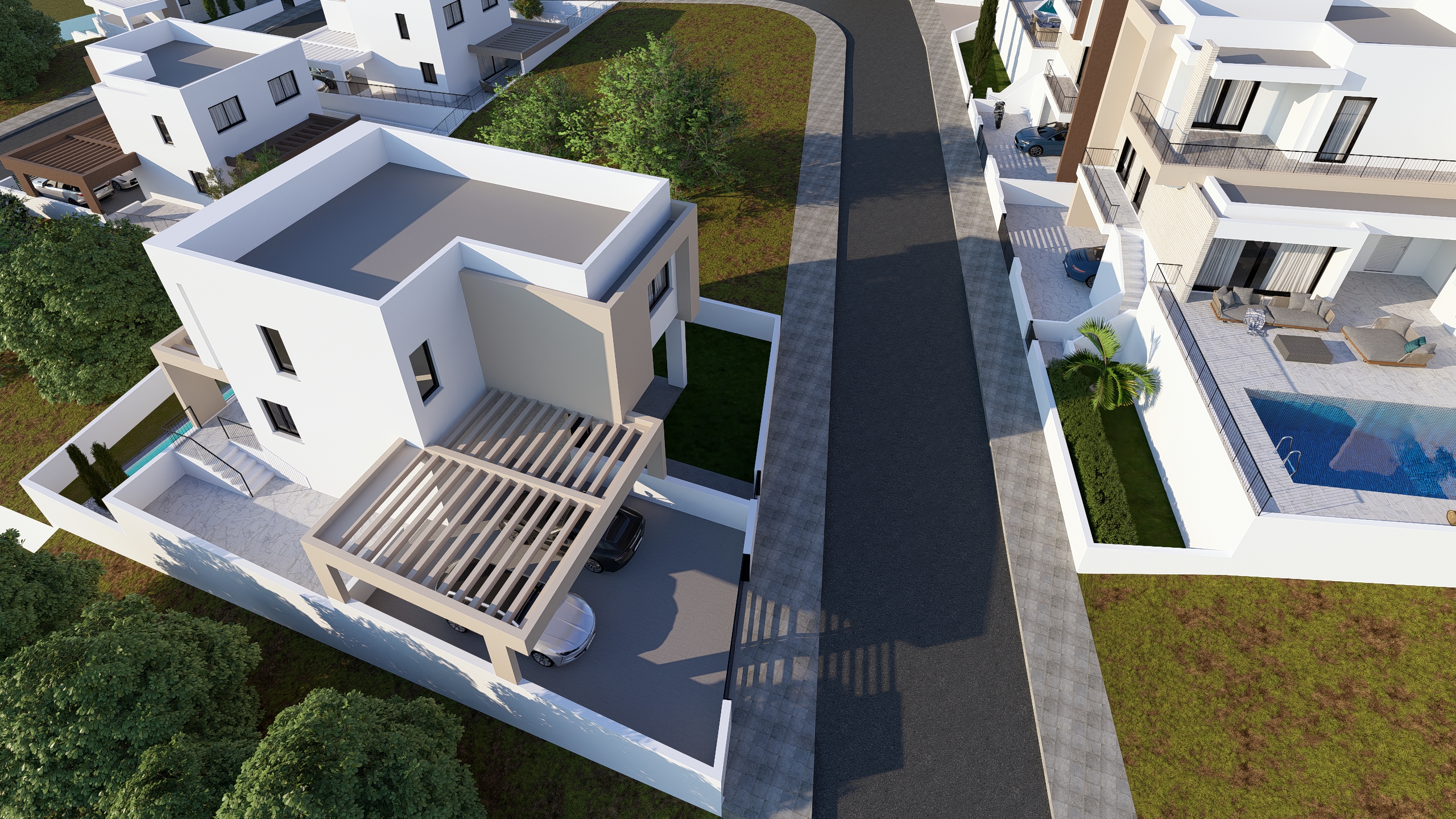 Modern 3-bedroom villa for sale in the peaceful residential area of Palodia, Limassol. This brand-new two-storey home (delivery October 2027) offers 150sqm of covered indoor space on a 376sqm plot, plus 14sqm of covered verandas and covered parking.