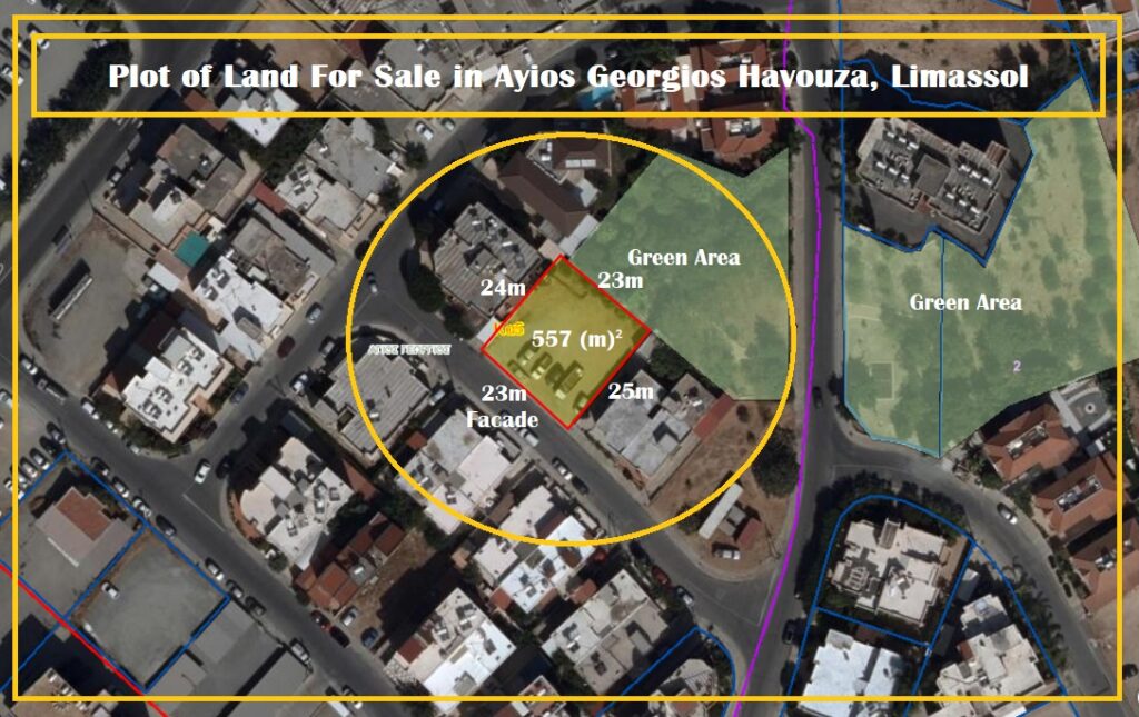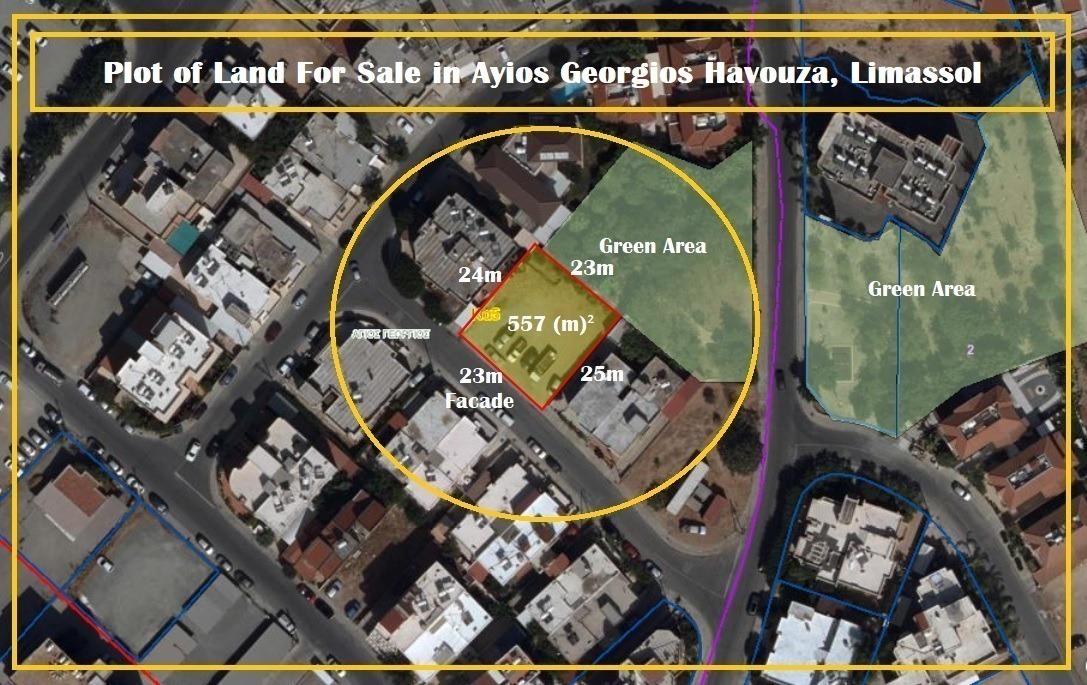 Its Area is 557 (m)², and it is considered Ideal for the development of residential apartments for sale. The wider area has experienced immense development during the last decade, and the demand from households for this kind of plots in the area has increased significantly. The plot is in relative proximity to all services and amenities such as Schools, Supermarkets, Restaurants, (Primary School of Agios Georgios Havouzas, Tsirio High School, American Academy, Frederick University, etc.).